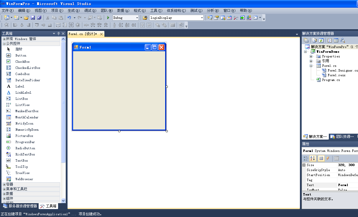 此时我们看到,正中间是一个空白窗体,等着我们去编辑,在空白窗体的左侧会看到工具箱栏,在工具栏箱里,列出了Windows窗体常用控件,在空白窗体右侧有两个窗体栏,右上边是解决方案资源管理器,作用是管理本项目的程序文件;右下边是属性栏窗体,作用是设置或修改窗体或控件的相应属性值。