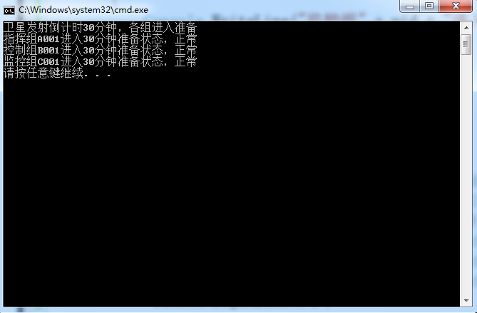 Console.WriteLine("卫星发射倒计时30分钟,各组进入准备");