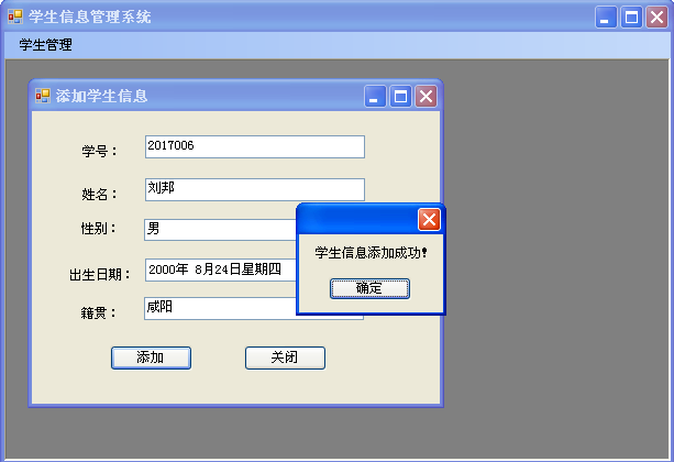 此时,用户输入要添加的学生信息,单击“添加”按钮,弹出”学生信息添加成功!”消息框,单击“关闭”按钮,关闭本窗体,效果如图8-3所示: