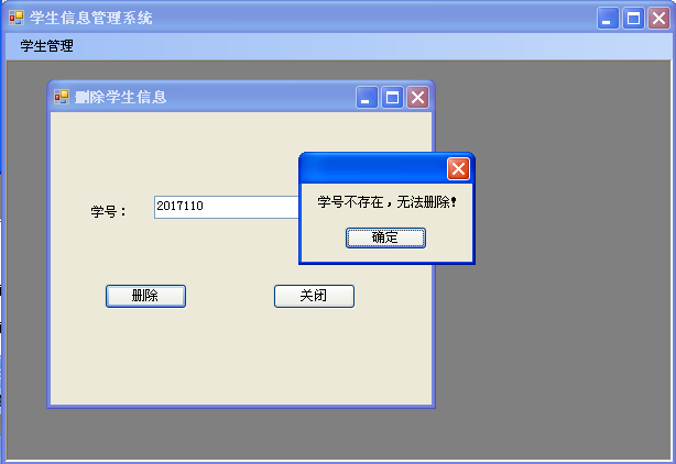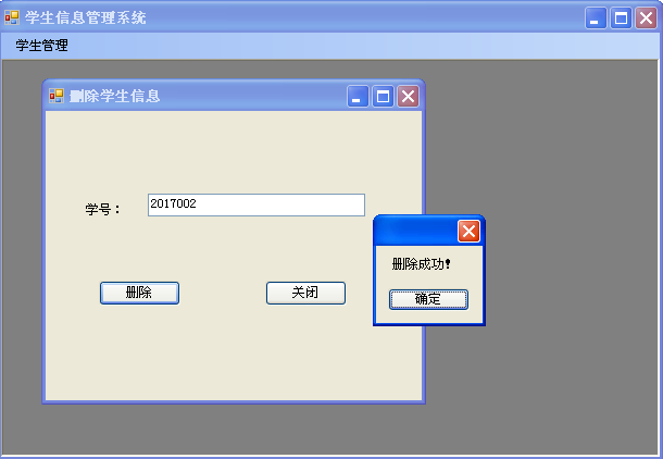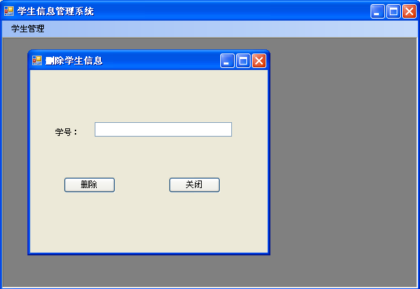 单击主窗体菜单的删除学生信息菜单,弹出删除学生信息窗体,单击“关闭”按钮,关闭本窗体。效果如图8-4所示: