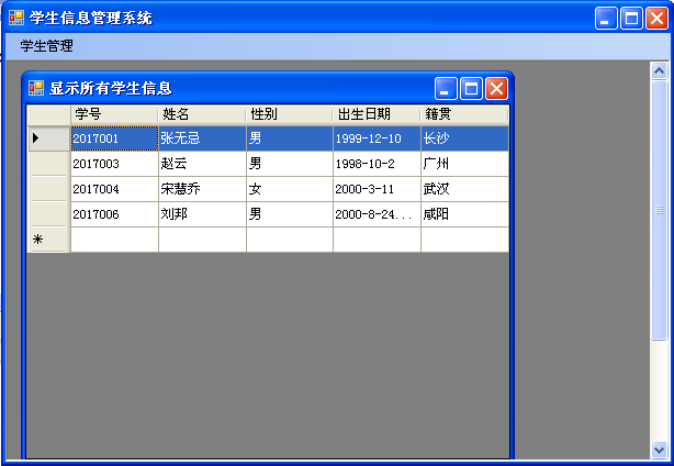 学生信息管理系统要求利用C#和ADO.NET编程,使用多文档窗体实现学生信息的增加、按学号删除学生、修改学生信息和显示所有学生信息的功能,系统主界面效果如图8-1所示: