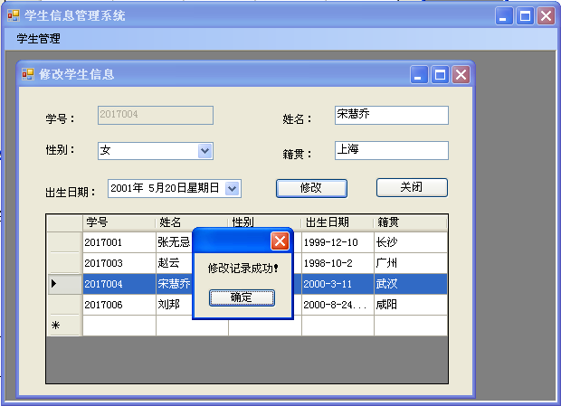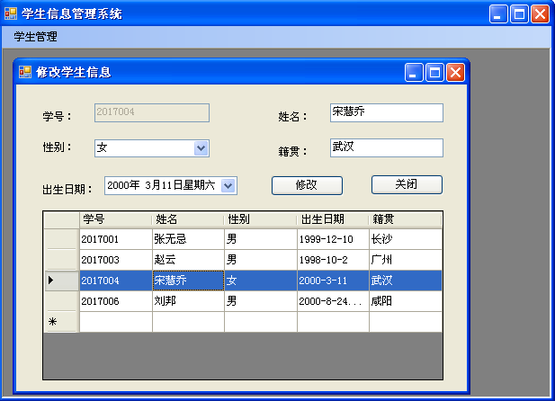 单击主窗体菜单的修改学生信息菜单,弹出修改学生信息窗体。窗体加载时,下方的列表显示所有学生信息,用户选中某行数据,将数据显示在上方对应文本框中,供用户修改 窗体中列名必须是中文。效果如图8-8所示: