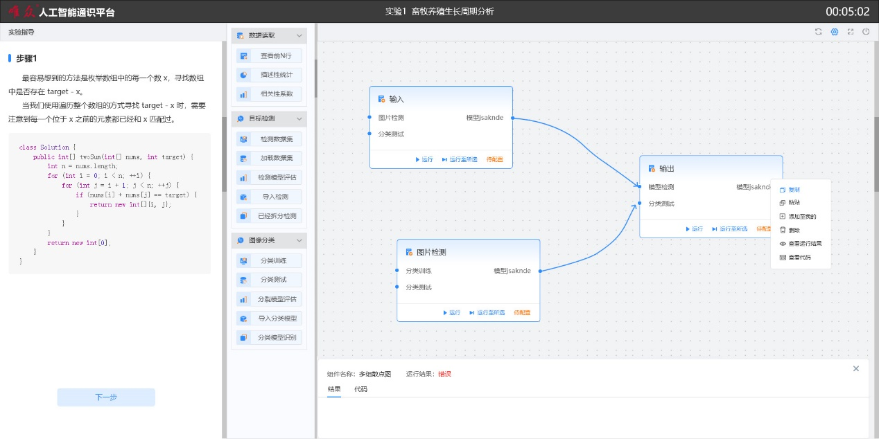 课堂实训闭环:学生提交完整实验报告(含画布连接逻辑),教师端可追溯执行过程。