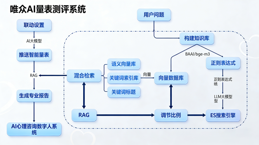 科学研判,实现精准化心理评测。平台搭载专业的AI量表测评系统,这一系统是唯众核心优势所在——不仅囊括近100种国际通行权威心理量表,全面覆盖情绪、压力、人格、适应性等多维度心理评估需求,更创新性实现与专业心理学知识库、智能体的深度融合。基于海量心理数据样本与专业心理学理论,AI量表测评系统与平台的数据分析模块、心理评测模块形成高效协同:智能体可结合专业知识库,对量表测评结果进行深度解读,通过大数据算法进一步挖掘数据背后的心理逻辑,精准识别师生心理困扰的类型、程度及深层诱因,生成兼具专业性与易懂性的个性化评测报告。这一体系不仅帮助心理教师快速掌握学生心理动态,也能为教师群体的心理状态评估提供科学支撑,真正实现“早发现、早干预、精准帮扶”的核心目标。