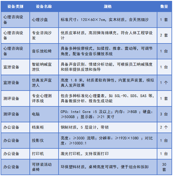 为了满足员工心理健康活动中心各功能室的专业需求,我们精心制定了以下硬件设备采购清单,涵盖心理咨询设备、宣泄设备、测评设备以及办公设备四大类,确保设备的专业性与实用性,为员工提供高质量的心理服务体验。