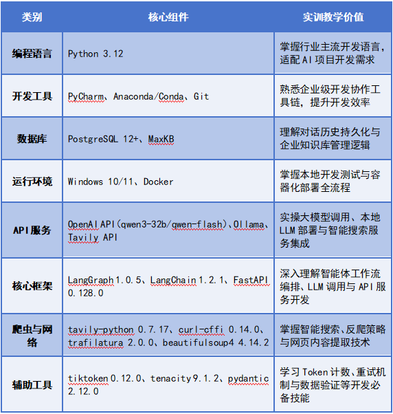 唯众AIGC基座智能体实训平台,深度复刻企业级智能知识检索系统WzSearch的核心架构,采用LangGraph工作流引擎与Agent状态机模式,构建从查询改写、多知识库检索、相关性评估到网页爬取的自动化流程。学习者将直接接触Python 3.12开发环境、PostgreSQL数据库存储、FastAPI接口服务等主流技术栈,实操langchain-openai、tavily-python等核心工具库,同步企业真实开发标准。